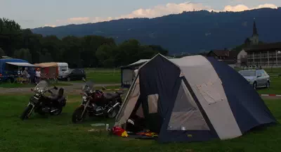 Als je gaat motorkamperen moet je een tent hebben, wat voor tent je neemt is een persoonlijke keuze. Onze 1e tent was een klein 2 persoons-tentje, prima met mooi weer, maar met een week regen is de lol er snel af. Zodoende hebben we nu een grote 4 persoons-tent waarin we wat meer ruimte hebben. Veel mensen hebben zich verbaasd dat we dat mee kregen op de motor, maar we hebben gemerkt, dat het meer het gewicht is wat telt, dan het volume van een tent. Zodoende is de tent van nylon en nemen we niet meer tentstokken/haringen mee dan noodzakelijk. Een hamer nemen we voor het opzetten van de tent niet mee, vaak kan je deze wel lenen van je buurman op de camping.