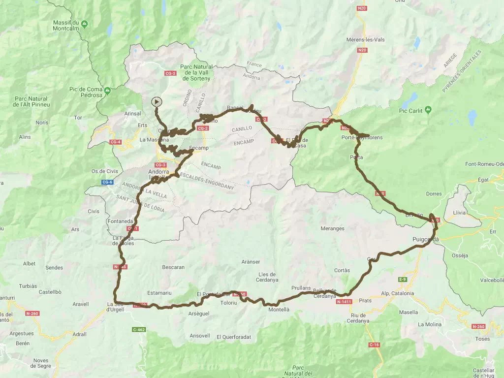 Start en eindpunt is in Ransol, dan via de Pas de la Casa naar Mérens-les-Vals (Frankrijk), naar Ascou, dan binnendoor naar de (Catalaanse) Pyreneeën richting Puyvalador, Formiguères, Matemale, La Llagonne, Eyne, Llo en naar Llívia (klein stukje Spanje). Dan via Porta weer terug richting Andorra. De route is zoveel mogelijk binnendoor met mooie wegen met haarspeldbochten.