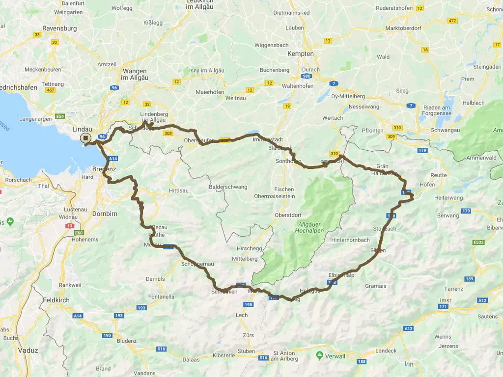 Start en eindpunt is Lindau, vanuit hier richting Oberjoch de grens over met Oostenrijk, over de Hochtannbergpass naar de Brittenberg en via Bregenz weer terug.