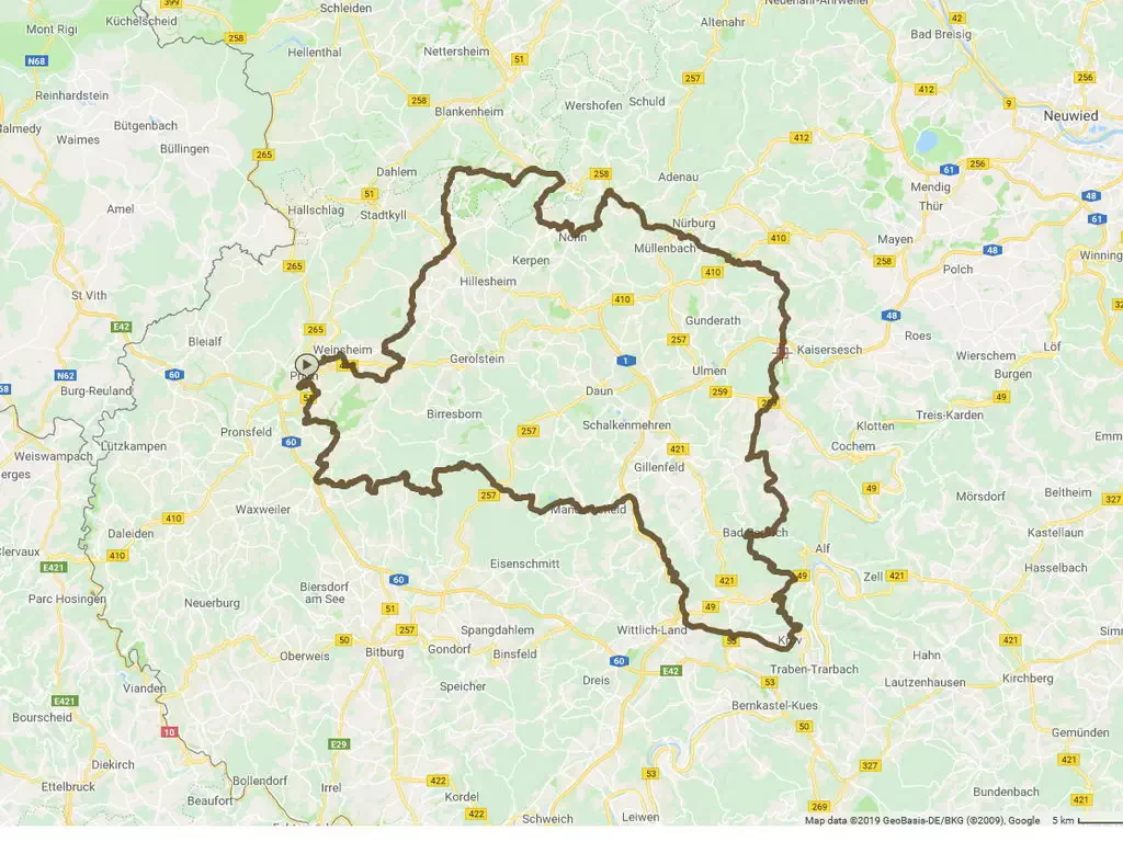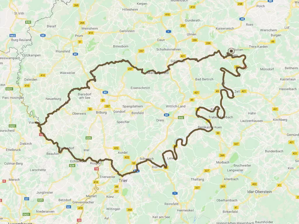 Vertrek en eindpunt is Prüm, zoveel mogelijk over de mooiste wegen binnendoor naar de Nürburgring, langs de Moezel richting Traben-Trarbach en binnendoor terug naar Prüm.