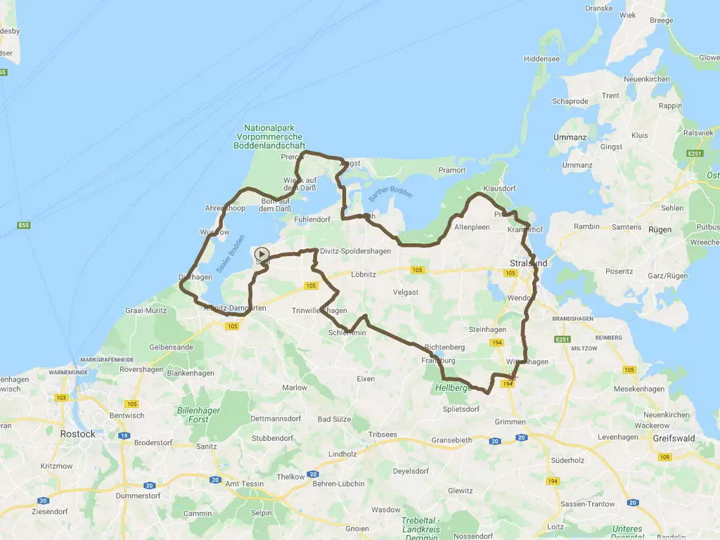 Begin en eindpunt van de motorroute is in Saal, dan langs de Saaler Bodden en door het Nationaal Park Vorpommersche Boddenlandschaft. Via het mooie centrum van Barth richting de stad Stralsund richting de Krummenhagener See. Dan via het natuurpark Hellberge binnendoor weer terug naar Saal. Onderweg kom je door vele toeristische dorpjes en steden, perfect om te stoppen voor een kop koffie en een lunch.