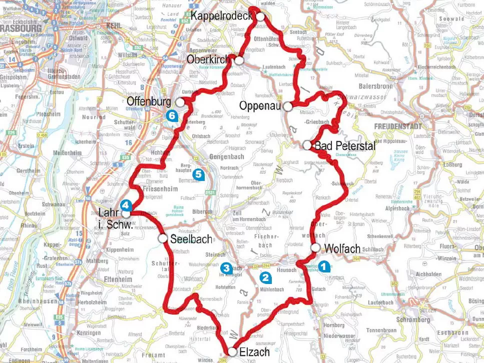 Start en eindpunt is in Wolfach dan naar Elzach, Seelbach, Lahr. i. Schw., Offenburg, Oberkich, Kappelrodeck, Oppenau en Bad Peterstal.