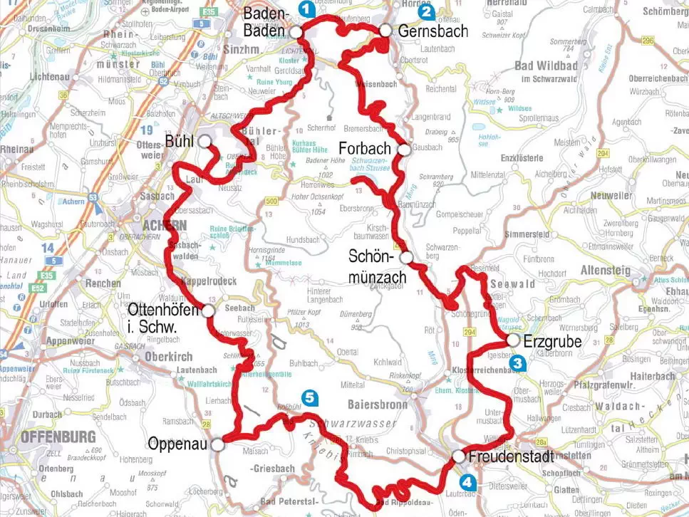 Start en eindpunt is in Baden-Baden dan naar Gernsbach, Forbach, Schön-münzach, ERzgrube, Freudenstadt, Oppenau, Ottenhöfen i. Schw. en Bühl.