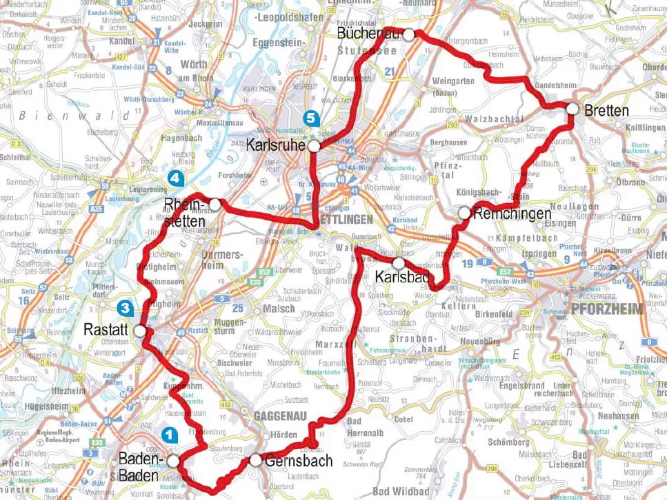Start en eindpunt is in Baden-Baden dan naar Rastatt, Rheinstetten, Karlsruhe, Büchenau, Bretten, Remchingen, Karlsbad en Gernsbach.