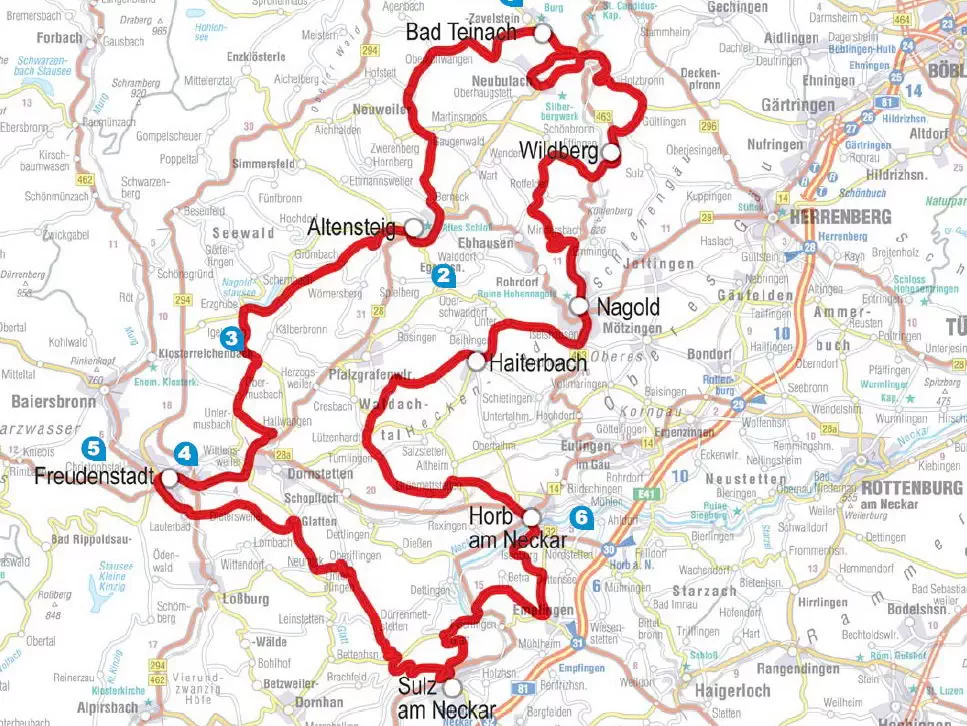 Start en eindpunt is in Bad Teinach dan naar Wildberg, Nagold, Haiterbach, Horb am Nackar, Sulz am Neckar, Freudenstadt en Altenteig.