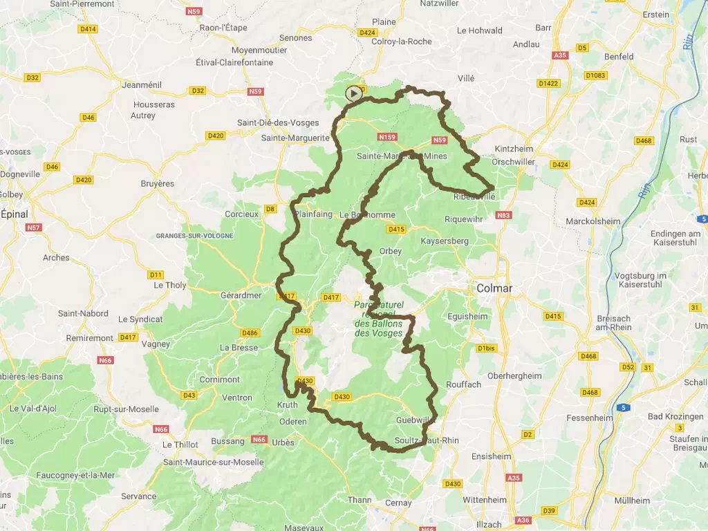 Start en eindpunt is in Ramonchamp, dan via de Route de Morbieux richting Basse-sur-le-Rupt, daarna richting Vagney. Dan omhoog, via de Route du Col, naar het Lac de Gérardmer, langs het Lac de Longemer Vologne en Lac de Kruth-Wildenstein. Dan binnendoor, met veel geslinger langs Le Grand Ballon, Fellering, Travexin en weer terug.