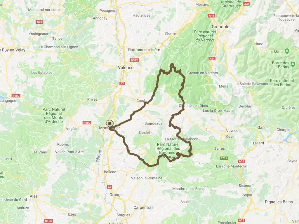 Start en eindpunt is in Montélimar, dan omhoog richting Crest en een mooie slingerende ronde door het regionaal natuurpark Vercors. Op het einde doorsteken naar het regionaal park baronnies Provençales, hier met een slingerende route weer koers zetten richting Montélimar. Mocht de route te lang zijn, dan kan je halverwege bij de doorsteek nog terug.