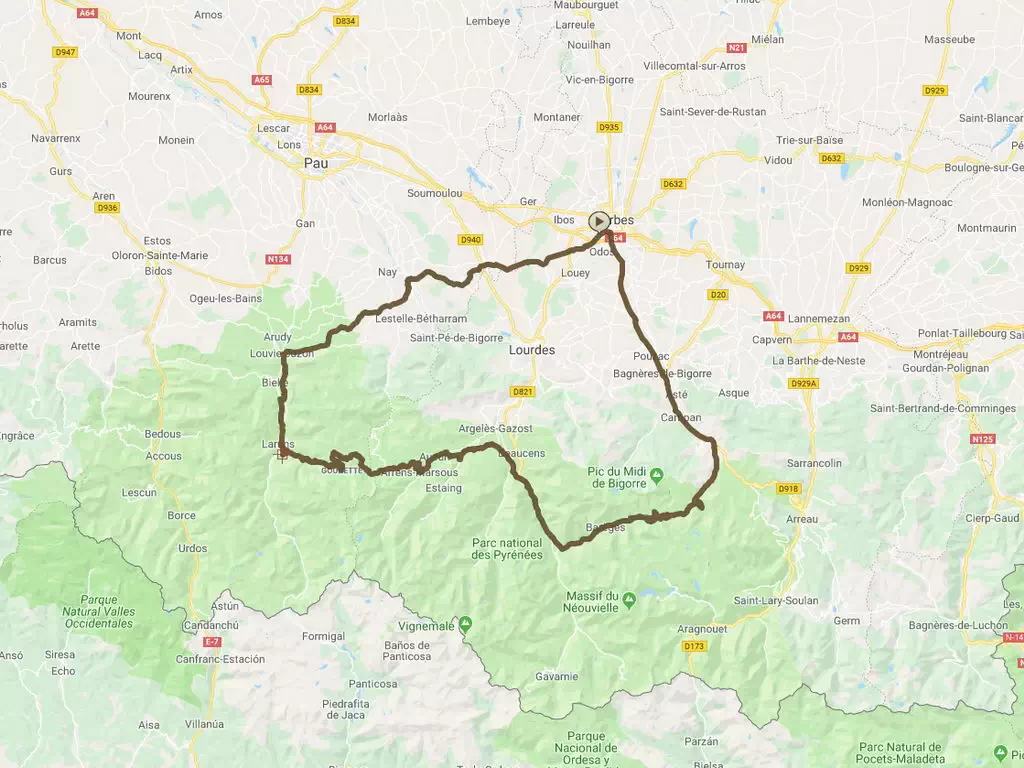 Start en eindpunt is in Tarbes, dan via Coarraze naar Castet. Over de Col d'Aubisque, Col du Soulor naar Aucun en via de Route du Tourmalet weer terug.