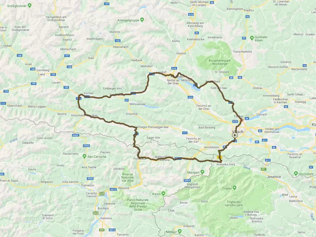 Start- en eindpunt is in Villach Oostenrijk (Karinthië), daarna via de Würzenpass naar Slovenië, dan richting Italië en bij Tarvisio de grens over. Dan via de Nassfeldpass (SP110) richting Oostenrijk. Dan via Tröpolach, Dellach over de Plöckenpass en binnendoor richting de Millstätter See en binnendoor weer terug naar Villach.