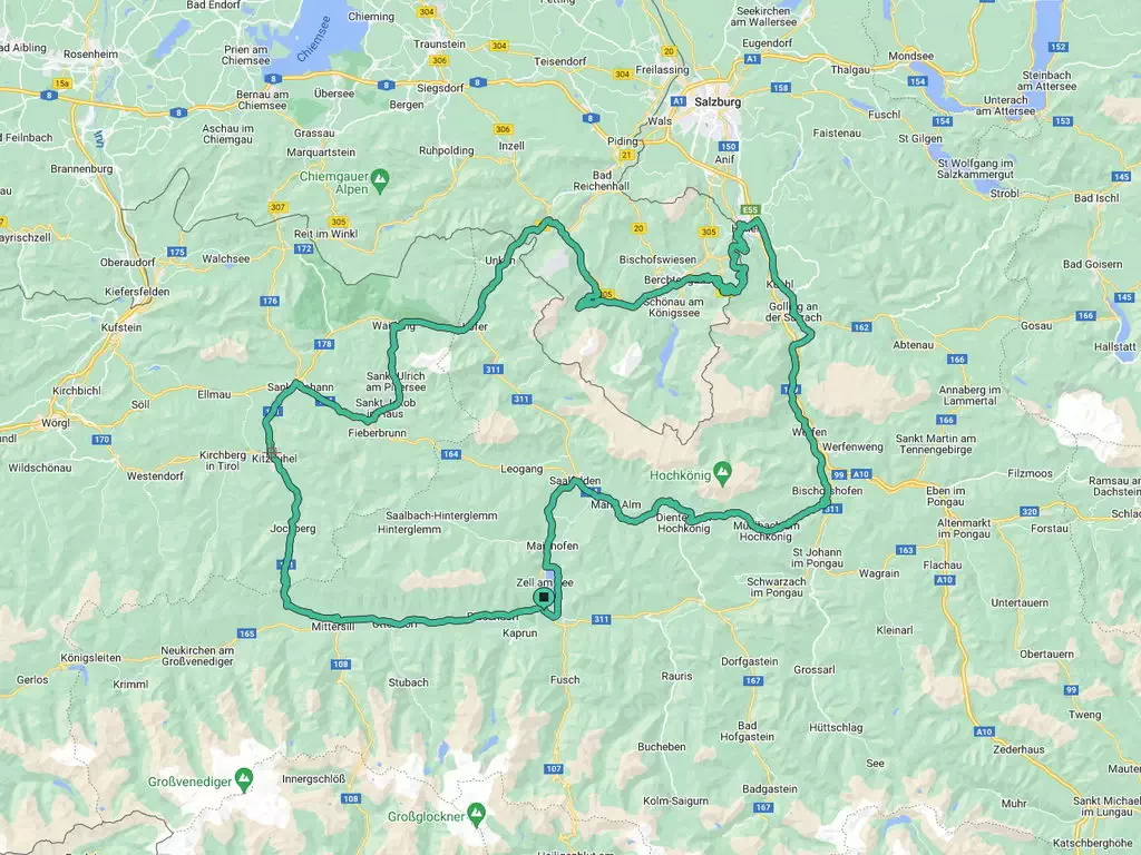 Start en eindpunt van deze motorroute is in Zell am See. Vanuit hier rij je naar Saalfleden, Maria Alm en Hinterthal om dan langs het Hochkönig gebergte te rijden via de plaatsen Dienten am Hochkönig en Mühlbach am Hochkönig. Aangekomen in Bischofshofen rijd je naar Hallein om daar de grens met Duitsland over te gaan. In Duitsland rij je via de Rossfeld Panorama Straße naar de Hinter-See om via Schneizlreuth de grens met Oostenrijk weer over te gaan. Via Lofer naar Waidring en dan langs de Pillersee koers zetten naar St. Johann in Tirol. Dan richting Kitzbühel en Mittersill om vervolgens weer terug te keren in Zell am See.