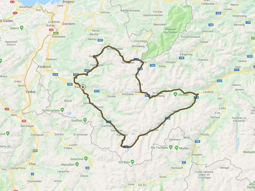 Start en eind is in Bludenz (Vorarlberg), dan over de Silvretta-Hochalpenstraße richting Ischgl (Tirol), Kappl dan door naar Sankt Anton am Arlberg, Lech en via de Bregenzerwaldstrasse weer richting Bludenz. Let op, de Silvretta-Hochalpenstrasse kost tol.