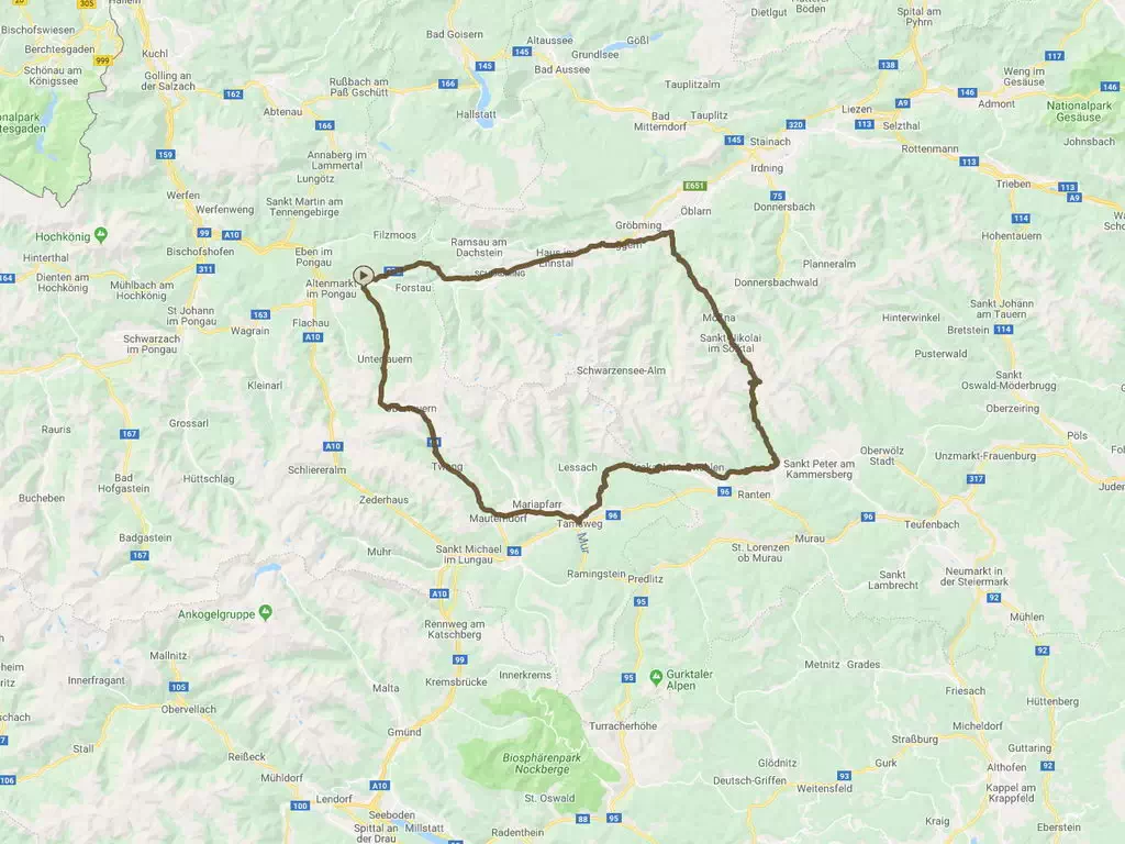 Start en eindpunt is in Hallstatt, dan binnendoor richting Tauplitz om vanuit daar richting Großsölk en de Sölkpass over te gaan. Daarna, vanaf Vorstadt Murau richting de Radstädter Tauernpas via de plaatsen Seebach, Tamsweg en Mauterndorf. Na de Radstädter Tauernpas, via Radstadt weer terug richting Hallstatt, hierbij rij je prachtig binnendoor via Eben im Pongau, Annaberg im Lammertal en Gosau om weer terug te keren in Hallstatt.